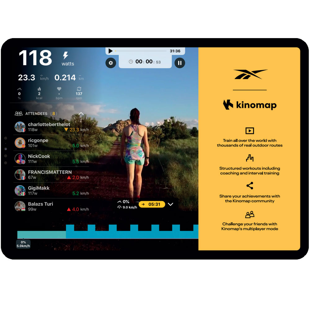 - Kinomap compatible – run real-world routes, challenge your friends and analyse workouts