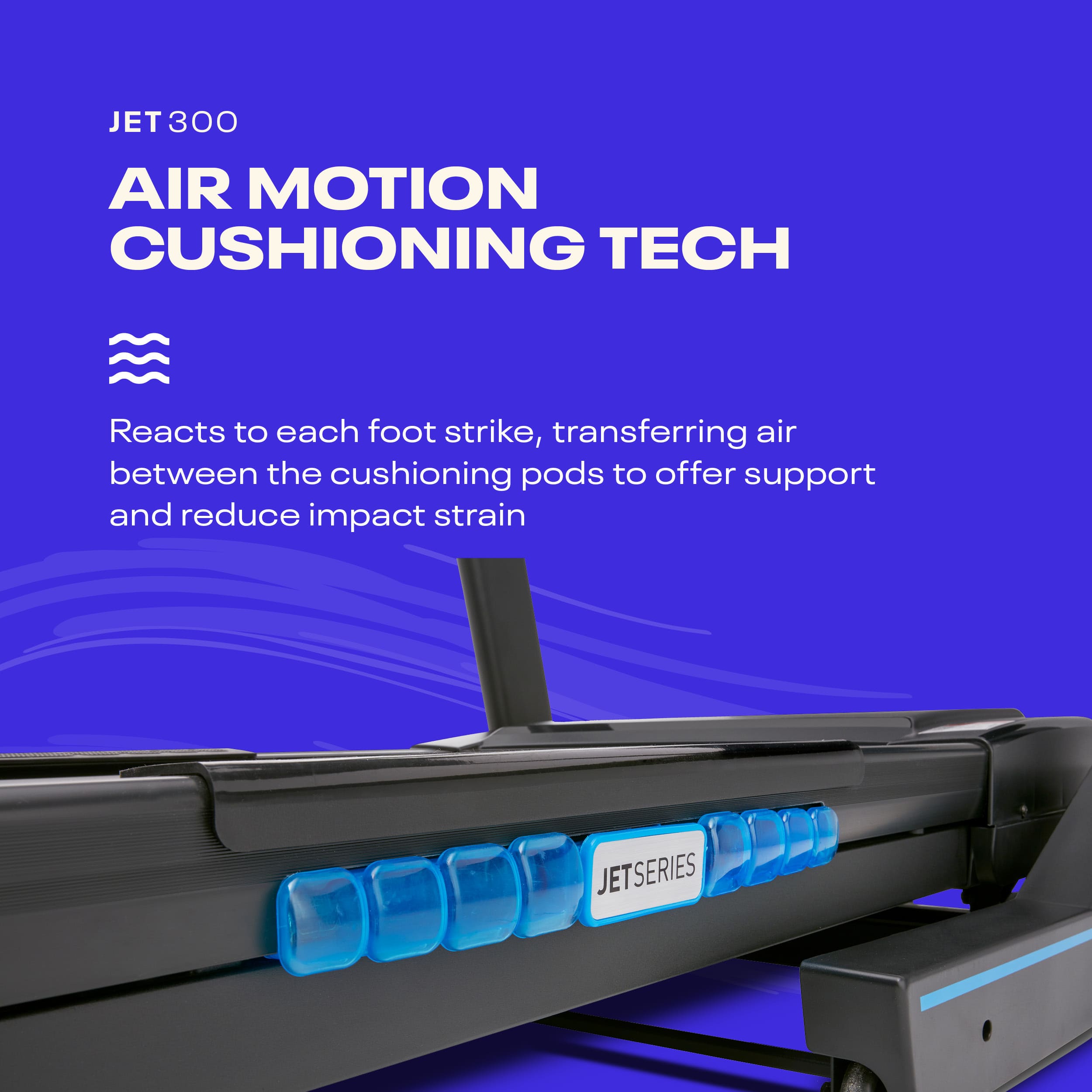 Equipped with a strong 2.5 HP motor at the heart of the treadmill, the Reebok Jet 300 delivers powerful and quiet performance with a top speed of 12.4 mph. Providing you with 15 levels of power incline to intensify your runs, the 300 delivers three user-defined, three heart rate control and three custom target workouts whilst 24 pre-set programs kick-start your regime straight from set up. Complete with integrated Air Motion Cushioning Technology, the uniquely designed pod structure transfers air through its eight sections to offer you support where it's needed - resulting in smoother and less abrasive exercise.