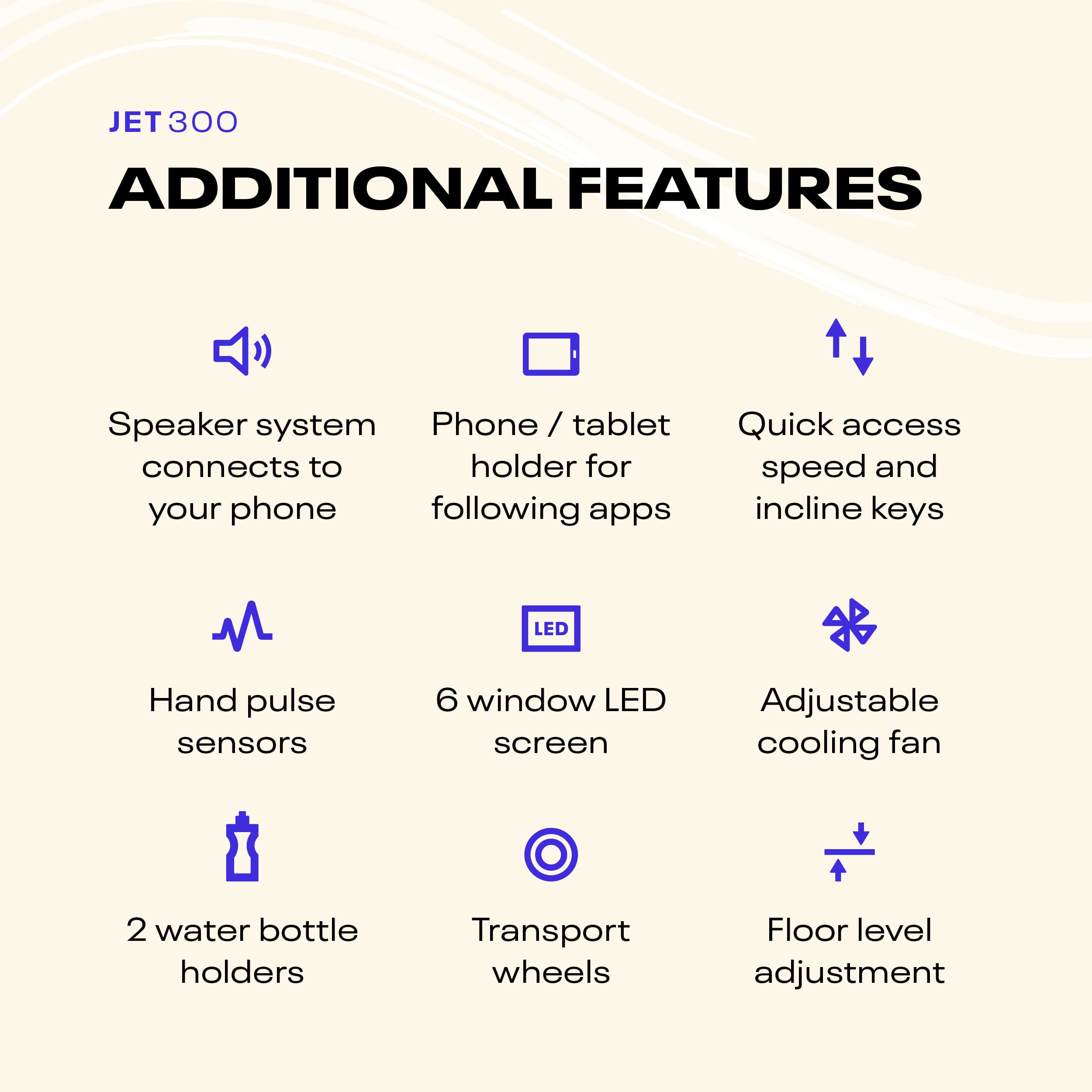 Delivering detailed real-time performance stats, the clear six-window LED screen + profile chart relays speed, time, distance and calorie metrics including heart-rate info straight from the treadmill's hand pulse sensors. Fitted with a smartphone/tablet holder atop the control console, the Jet 300 allows you to watch your favorite shows or listen to your training playlists through the integrated 5W speakers.