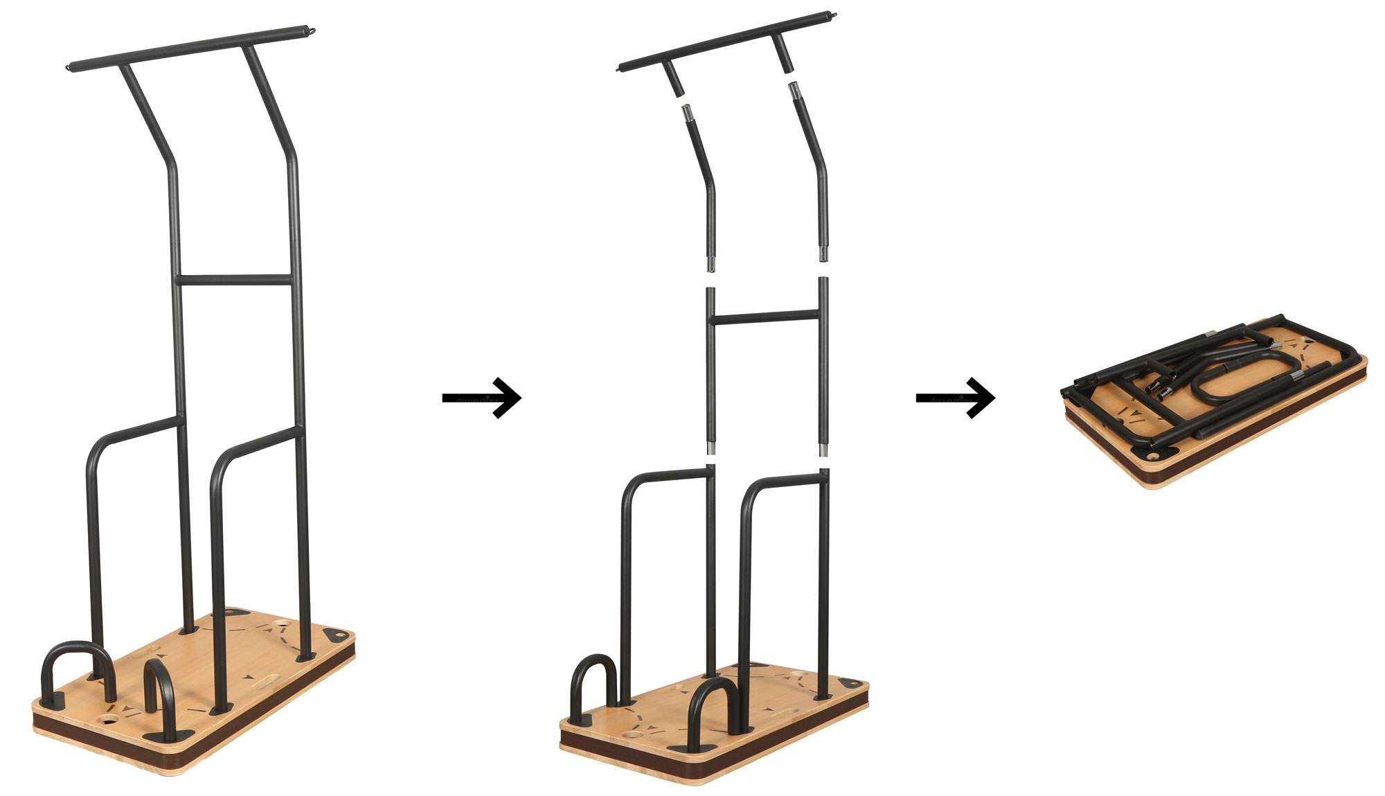 The steel bars included with the base can create a number of different setups from a full-sized pull-up bar to dip bars, pushup handles, and more. Assembly requires no tools and was made to be easy for anyone, with the bars being simply get slotted into place.