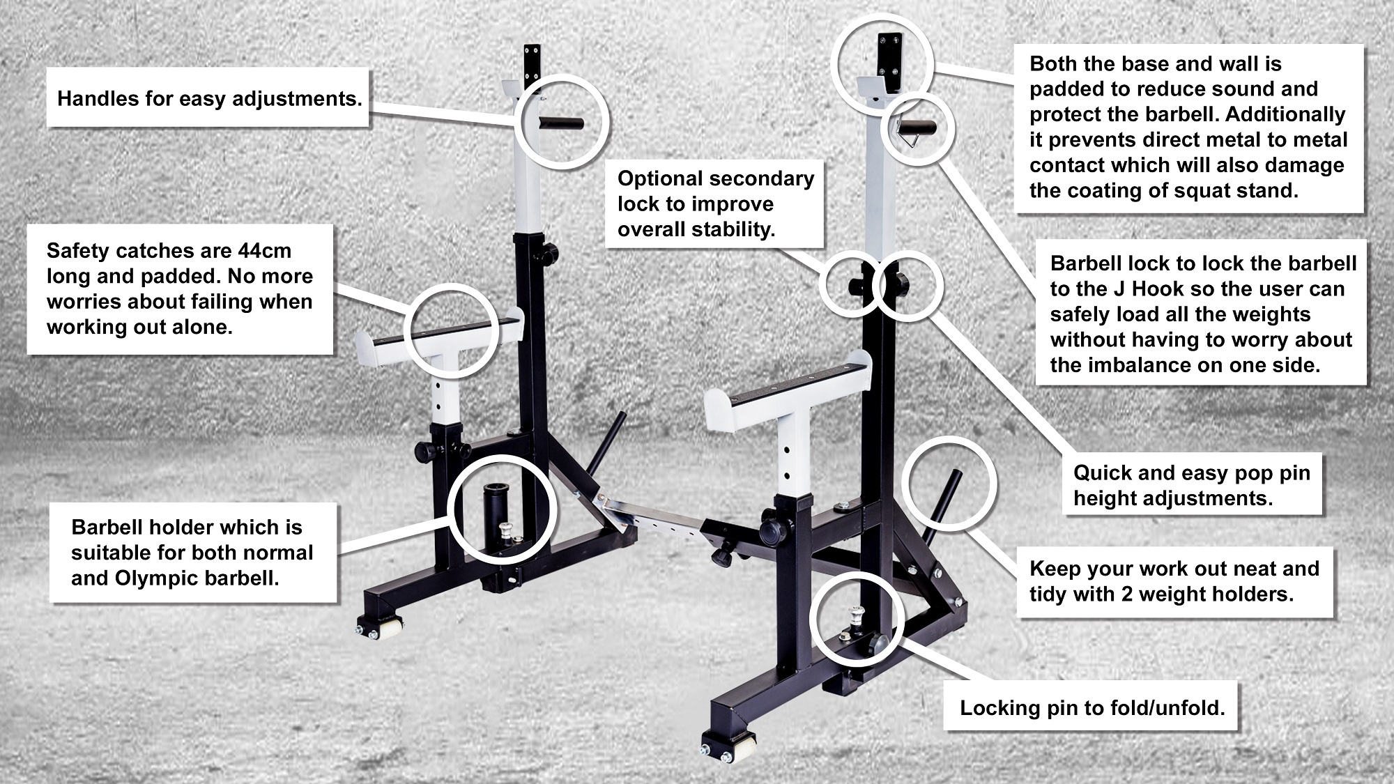 Safety catches are 44cm long, much longer than similar size squat rack in the market. No more worries about failing when working out alone.