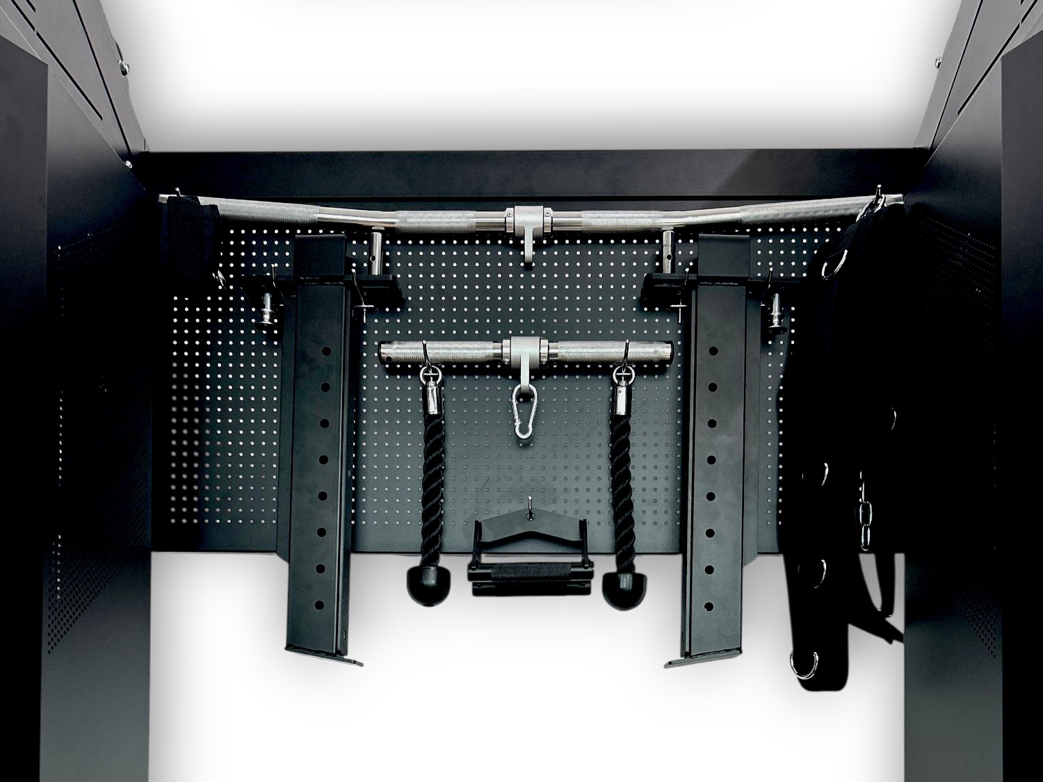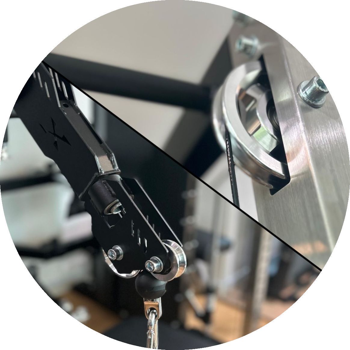 - 2 x 90kg weight stacks (using 1:1 and 2:1 pulley ratio)