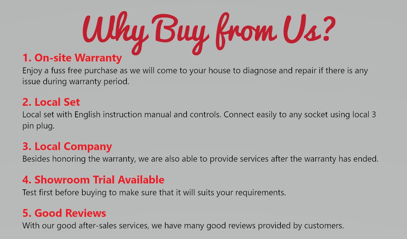 | Warranty | Main motor: 1 years, Other parts: 1 year, On-site labour: 1 year |