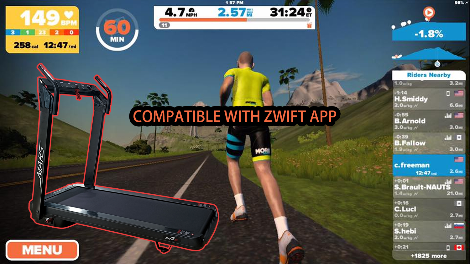Makes your training fun by linking to 3rd party apps like Zwift. Control the speed directly from your tablet with quick adjust buttons.